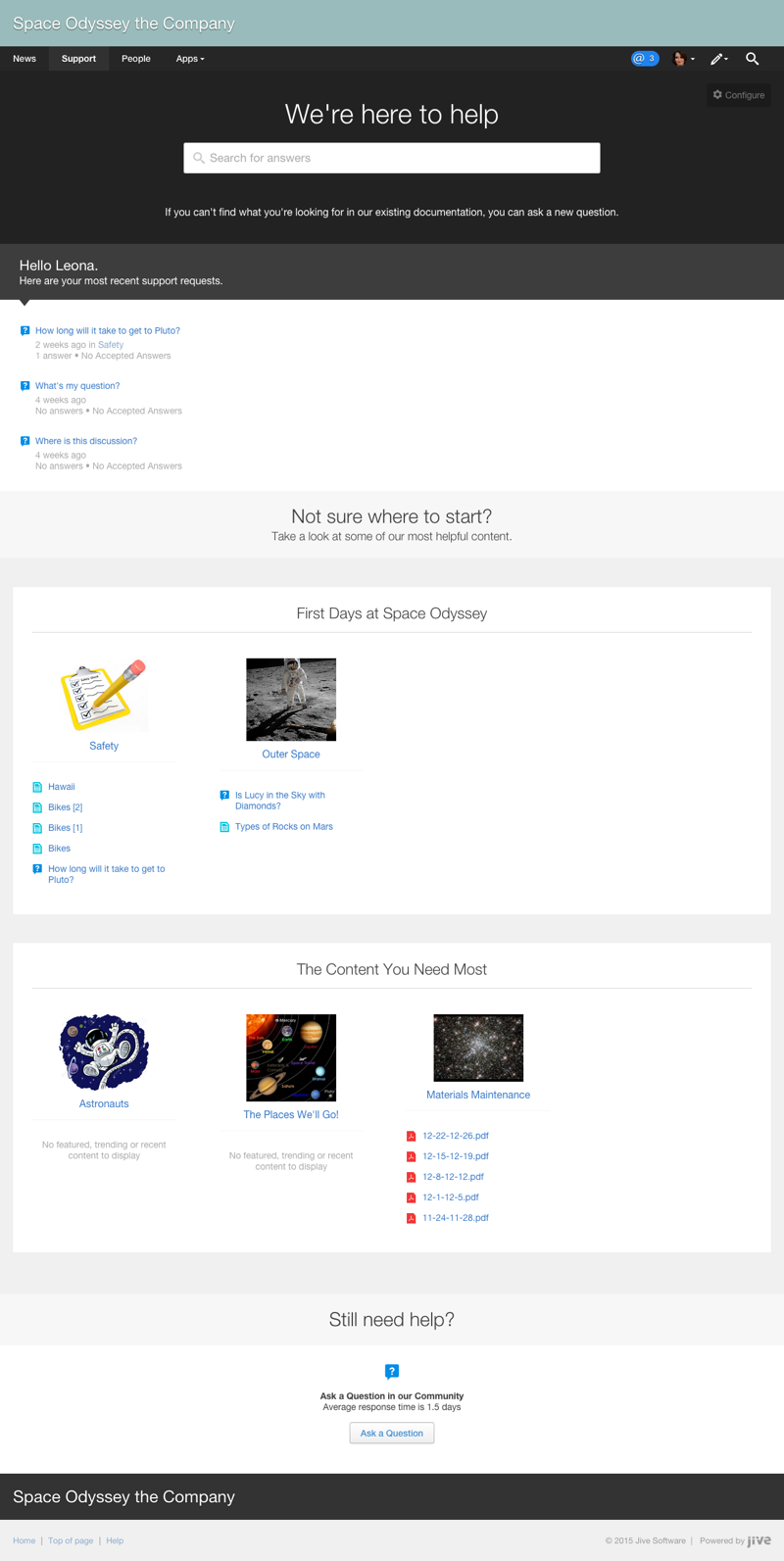 Here's a sample of how you might set up Support Center for an internal community for a space exploration company.